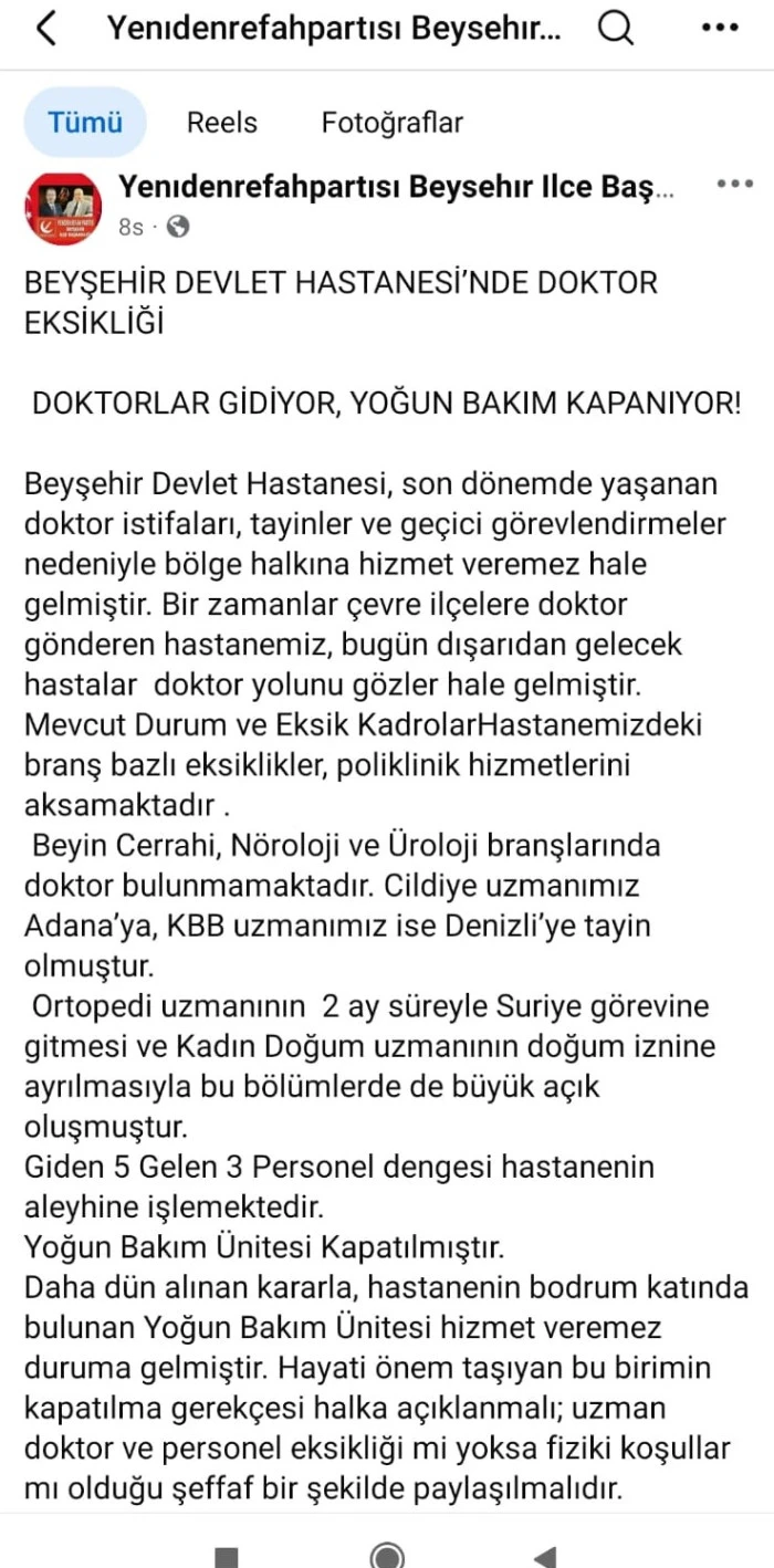 YRP Beyşehir İlçe Başkanlığı tarafından yapılan açıklamada, hastanede son dönemde yaşanan doktor istifaları, tayinler ve geçici görevlendirmeler nedeniyle hizmetlerin aksadığı öne sürüldü.