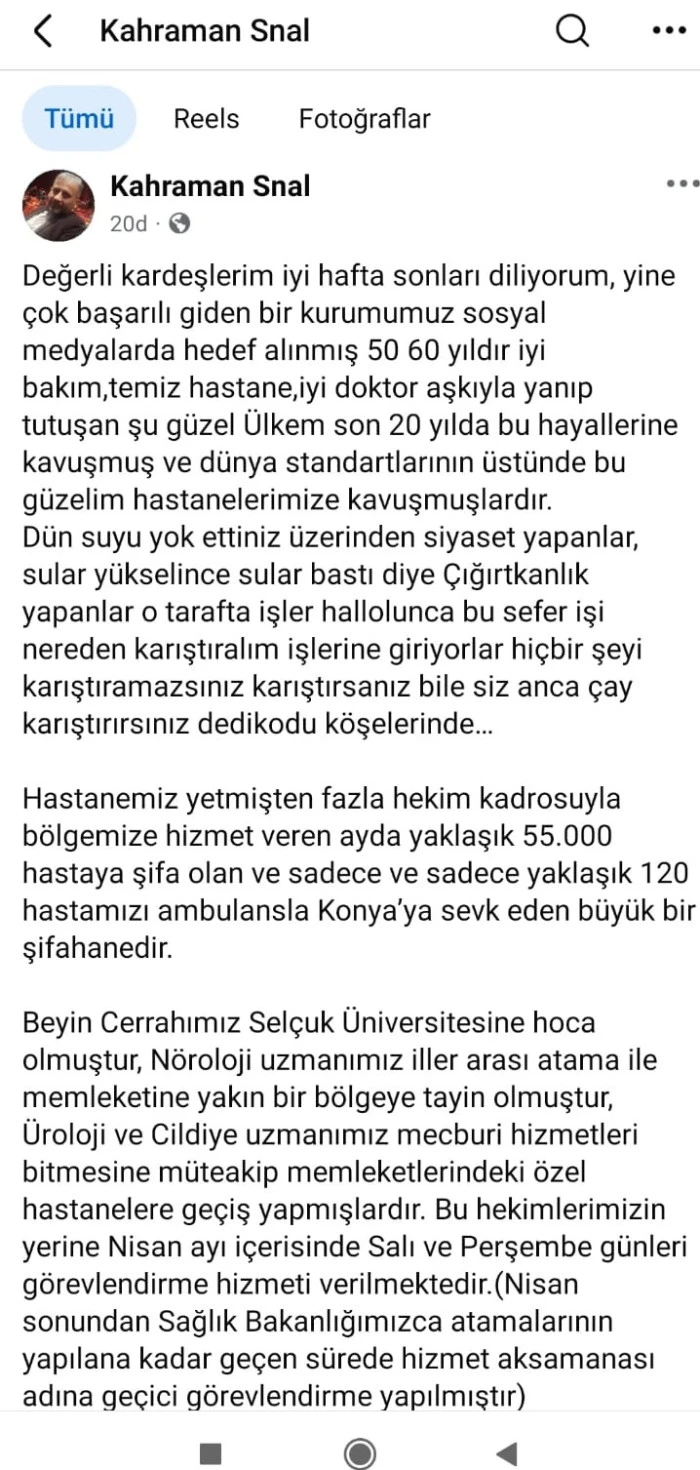 “Hastanemizde yeterli branş doktoru ve yoğun bakım hizmeti kalmadığı için hastalar en küçük müdahalede dahi Konya’ya sevk edilmektedir. Beyşehir halkı sağlık hizmetini yerinde almak istemektedir.”
