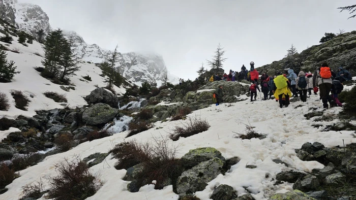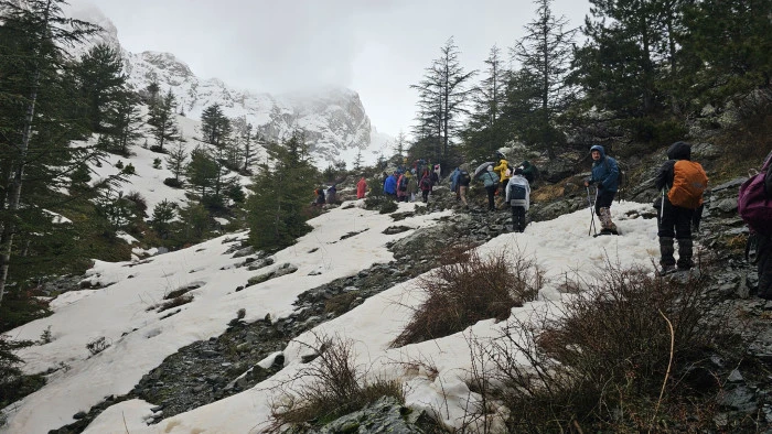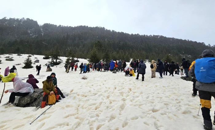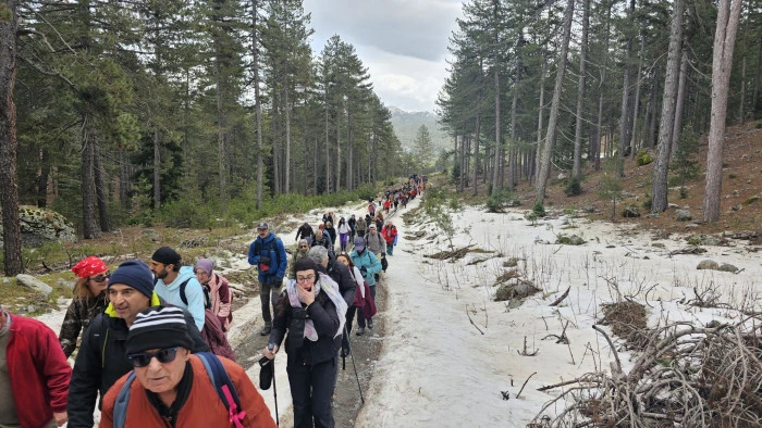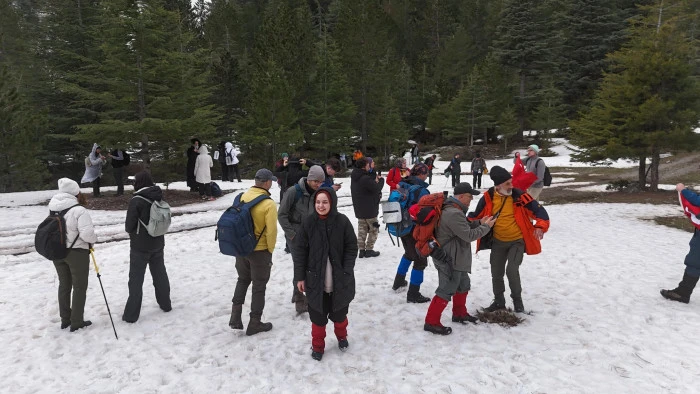 Katılımcılar, beyaz örtüyle kaplı orman ağaçlarının arasında, eriyen karların ve yağmurun oluşturduğu pınarlar arasında coşkulu bir yürüyüş yaptı. Karlarla kaplı doğa, doğaseverlere unutulmaz anlar yaşattı.