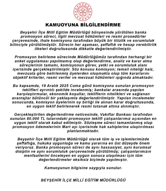 Beyşehir İlçe Millî Eğitim Müdürlüğü, uzun süredir merakla beklenen banka promosyon ihale sürecinin tamamlandığını duyurdu.