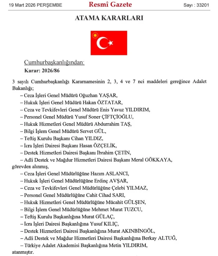 Konya’nın Beyşehir ilçesi Kurucuova Mahallesi nüfusuna kayıtlı Yargıtay Cumhuriyet Savcısı Hazım Aslancı, 19 Mart 2026 tarihli Resmî Gazete’de yayımlanan Cumhurbaşkanlığı kararnamesiyle Adalet Bakanlığı Ceza İşleri Genel Müdürü olarak atandı.