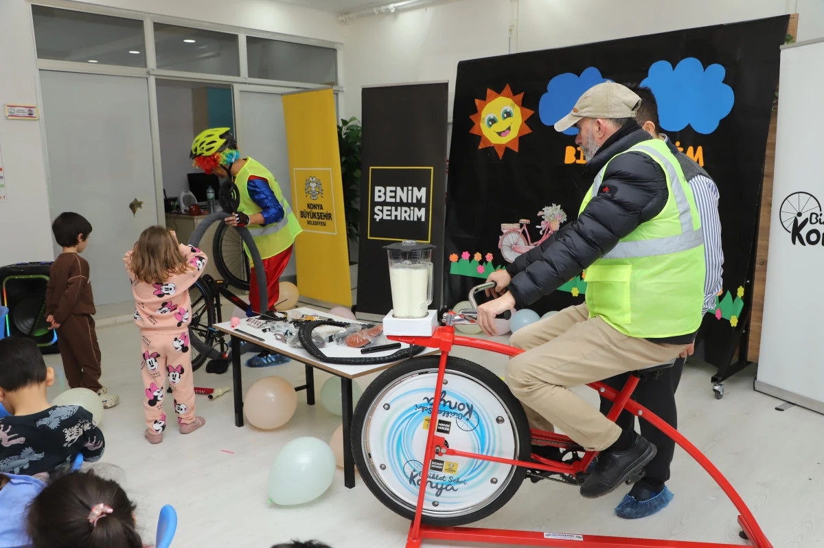 Blender bisikletlerle içecek hazırlayan, bisiklet temalı müzikler eşliğinde keyifli vakit geçiren çocuklara, reflektörlü yelek, kask ve koruyucu ekipmanların önemi de uygulamalı olarak anlatılıyor.