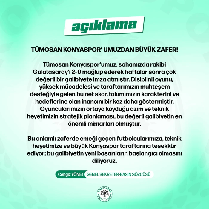 Taraftarının muhteşem desteğini arkasına alan yeşil-beyazlılar, sahada sergilediği disiplinli oyun ve yüksek mücadele ruhuyla kritik bir üç puanı hanesine yazdırdı. Kulüp Genel Sekreteri ve Basın Sözcüsü Cengiz Yönet, galibiyetin ardından yaptığı açıklamada bu başarının tesadüf olmadığını vurguladı. Yönet, "Oyuncularımızın azmi ve teknik heyetimizin stratejik planlaması bu zaferin mimarıdır. Bu sonuç, takımımızın karakterini ve hedeflerimize olan inancımızı bir kez daha kanıtladı," ifadelerini kullandı. Camianın kenetlendiği bu anlamlı galibiyetin, Konyaspor için yeni bir yükseliş döneminin başlangıcı olması bekleniyor.