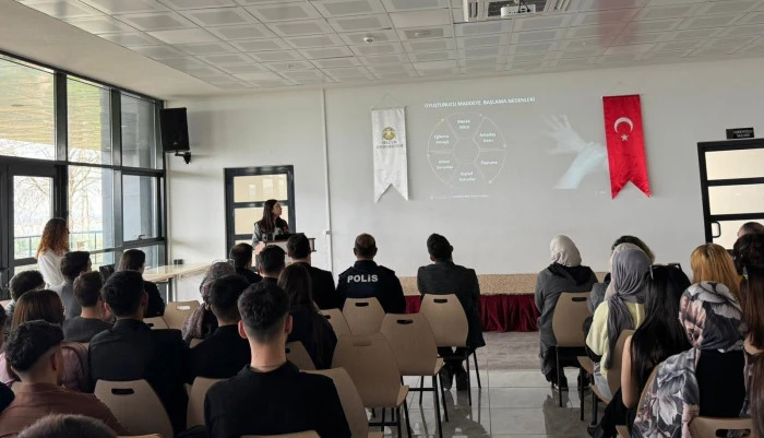 Seminerde konuşmacı olarak yer alan polis memuru Bilgen Önen, madde bağımlılığının bireysel olduğu kadar toplumsal bir sorun olduğuna dikkat çekti.