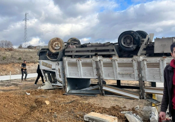 Konya’da seyir halindeki kamyon kara yolunda devrildi, sürücü kazayı şans eseri yara almadan atlattı.