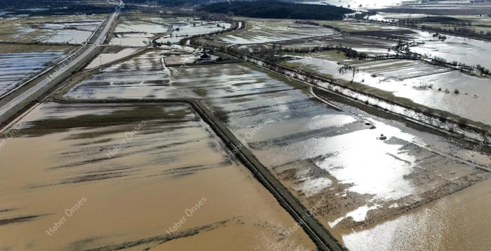 Öte yandan, Adaköy Mahallesindeki Apsıngır Ovası da taşkın sularından etkilendi. Geniş bir alana yayılan su birikintileri dron ile havadan görüntülendi.