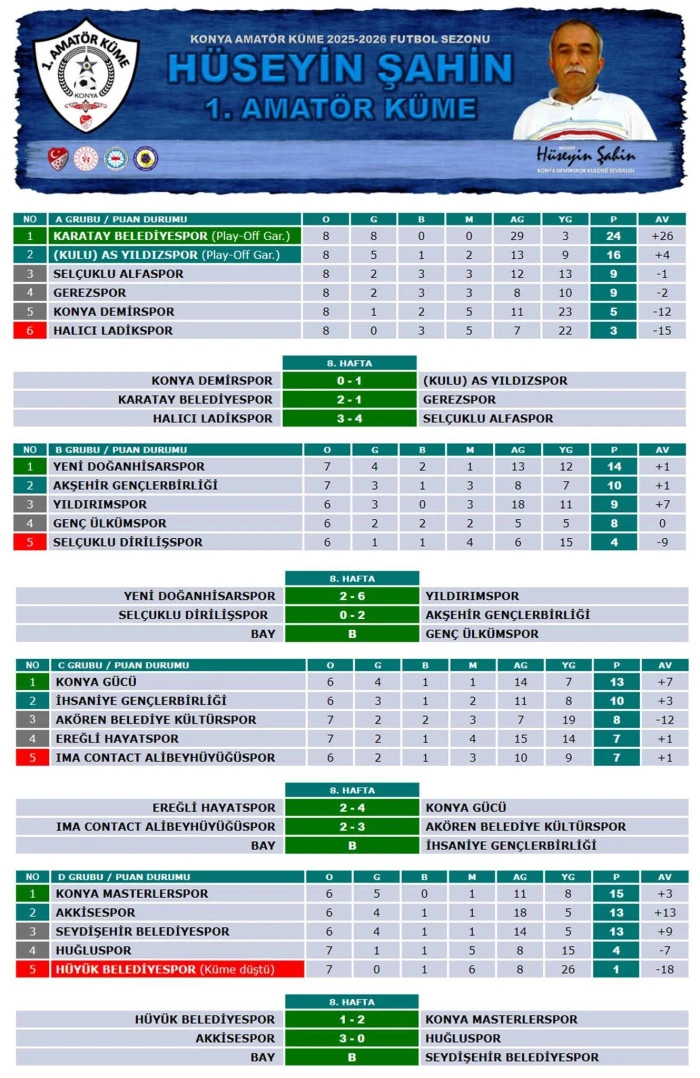 Bu sonuçla 1 puanda kalan Hüyük Belediyespor bir alt kümeye düşerken, lider Konya Masterlerspor ise aldığı galibiyetle şampiyonluk yolunda önemli bir avantaj elde etti. Seydişehir Belediyespor ise haftayı fikstür gereği maç yapmadan geçti.