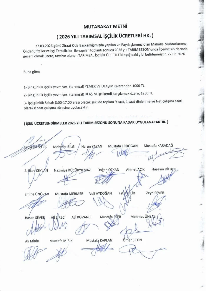 Belirlenen ücretlerin 2026 yılı tarım sezonu sonuna kadar geçerli olacağı bildirildi.