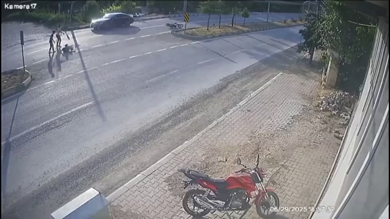 Görüntülerde, cadde üzerinde yan yana seyir halinde olan iki motosiklettin M.Ç.’nin kullandığı motosiklet aniden devrilerek sürüklenmeye başlanırken görülüyor.