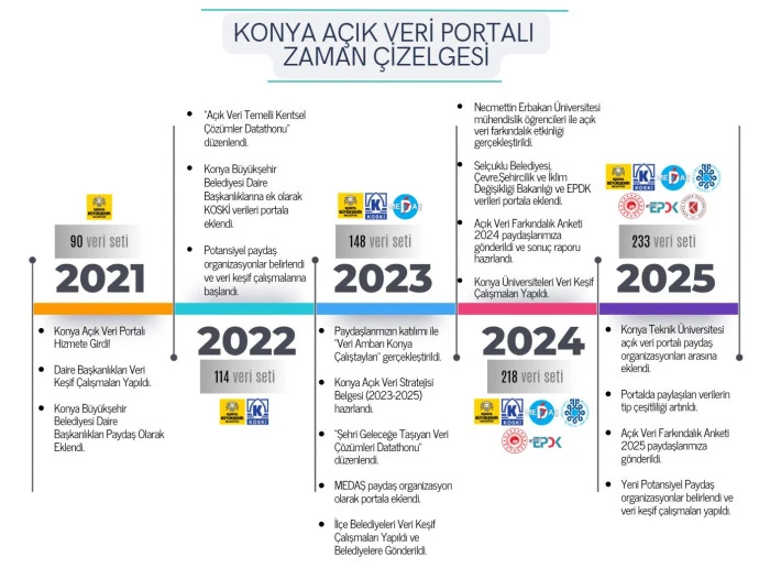 2021 yılından beri hizmet veren Konya Açık Veri Portalı, açık veriye dayalı şeffaf, katılımcı ve yenilikçi bir yönetim anlayışını desteklerken; kamu kurumları, akademi, özel sektör ve vatandaşlar arasında güçlü bir veri ekosistemi oluşturmayı hedefliyor.