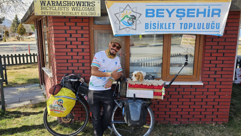 Köpeği ile dünya turuna çıkan bisiklet tutkunu,Beyşehir'de mola verdi