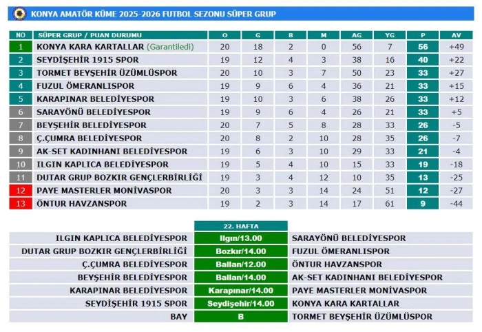 Konya Amatör Küme Süper Grup’ta 27. hafta heyecanında Beyşehir Belediyespor, Konya'da Kadınhanı Belediyespor ile karşı karşıya gelecek. Beyşehir’in bir diğer temsilcisi Tormet Üzümlüspor ise fikstür gereği haftayı maç yapmadan geçirecek.