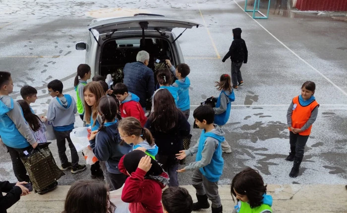 Minik öğrenciler, ihtiyaç sahibi arkadaşları için mont ve bot yardım kampanyası düzenledi.