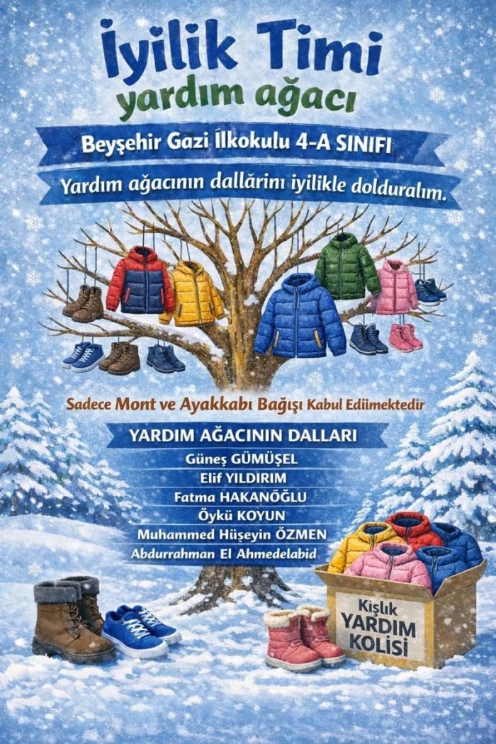 Beyşehir Gazi İlkokulu 4/A sınıfı “İyilik Timi” öğrencileri, “İyilik Ağacı – Dallarında İyilik Var” sloganıyla anlamlı bir sosyal sorumluluk çalışmasına imza attı.