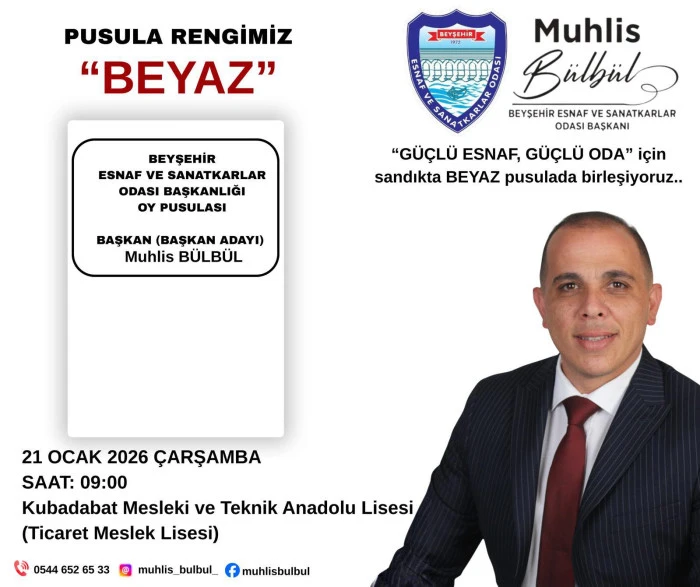 Seçimlerin saat 09.00’da Kubadabad Mesleki ve Teknik Anadolu Lisesi (Ticaret Meslek Lisesi)’nde yapılacağını hatırlatan Bülbül, sürecin Beyşehir esnafı için hayırlı olmasını temenni etti.