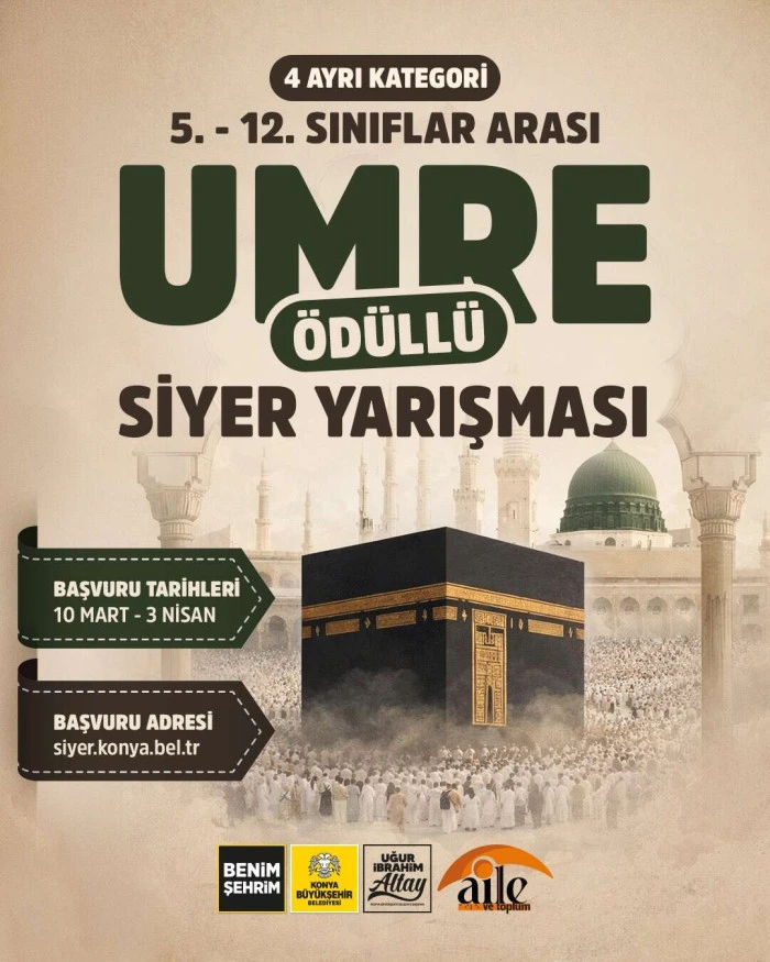 Konya Büyükşehir Belediyesi, gençlerin Hz. Muhammed’in hayatını doğru kaynaklardan öğrenmesini teşvik etmek amacıyla Umre ödüllü Siyer Bilgi Yarışması düzenliyor. Yarışmada 100 öğrenci ailesiyle birlikte umreye gönderilecek.