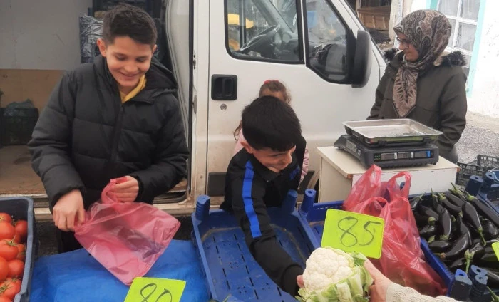 Proje kapsamında öğrenciler, ilçe pazarında pazarcılarla birlikte tezgah başına geçerek satış deneyimi yaşadı. Bu etkinlikle öğrenciler, emeğin, alın terinin ve üretimin değerini yerinde öğrenme fırsatı buldu.