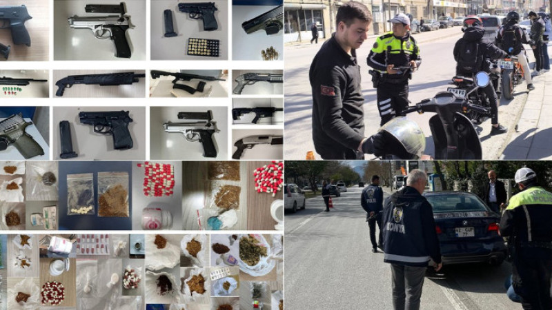 Asayiş ve narkotik suçlarla mücadele kapsamında yapılan operasyonlarda; 31 adet ruhsatsız tabanca, 20 adet kurusıkı tabanca, 32 adet ruhsatsız av tüfeği, 1 adet uzun namlulu silah, 404 adet kesici-delici alet, 1.020 adet fişek, 3 adet havalı tabanca, 64,33 gram metamfetamin, 620,92 gram esrar, 19,96 gram eroin, 620,21 gram sentetik kannabinoid (bonzai), 902 adet sentetik ecza (uyuşturucu hap) ve 2.506 paket kaçak sigara ele geçirildi.