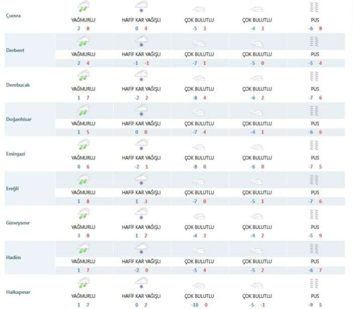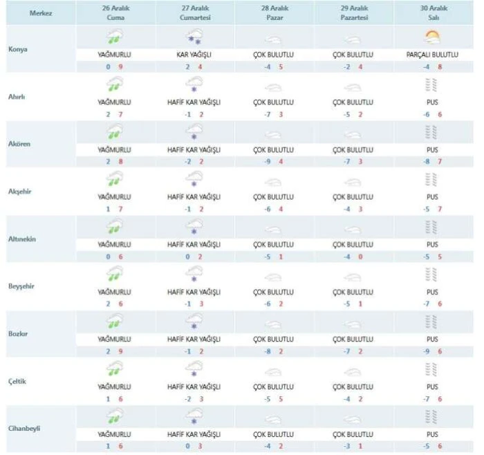 Tahminlere göre 26 Aralık Cuma günü Konya genelinde yağmur yağışı bekleniyor.