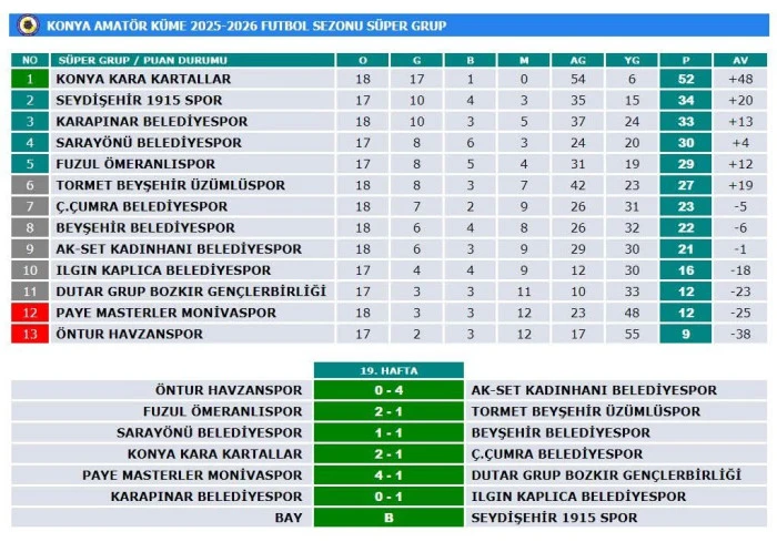 Konya Amatör Süper Grup’ta play-off yarışı her geçen hafta daha da kızışıyor. 19. hafta karşılaşmalarında Beyşehir temsilcileri kritik puan kayıpları yaşadı.