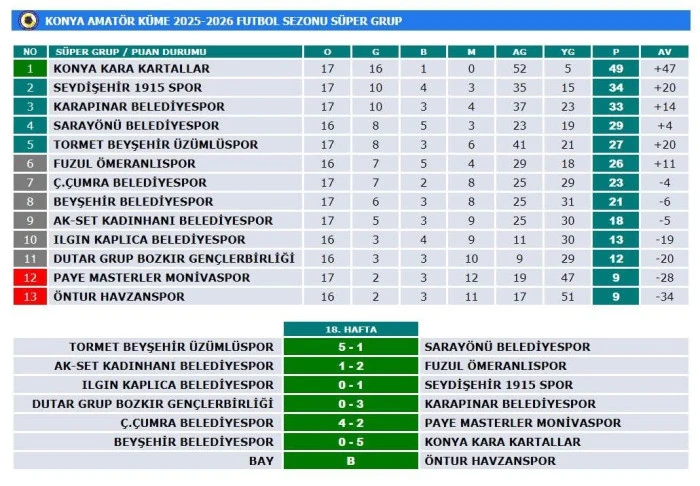 Öte yandan Beyşehir Belediyespor, Konya’da oynanan mücadelede lider Kara Kartallarspor karşısında istediği sonucu alamadı. Mavi-beyazlılar sahadan 5-0 mağlup ayrılarak play-off yarışında önemli bir kayıp yaşadı.