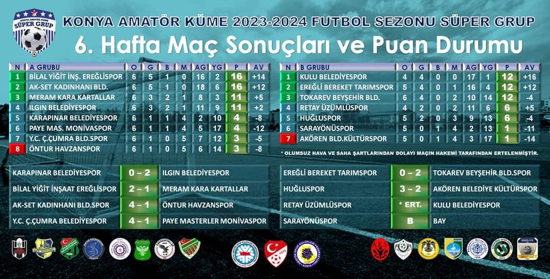 B Grubu’nda hafta sonu Retay Üzümlüspor ile Kulu Belediyespor arasında oynanması gereken lig müsabakası ise olumsuz hava koşulları dolayısıyla ileri bir tarihe ertelendi.