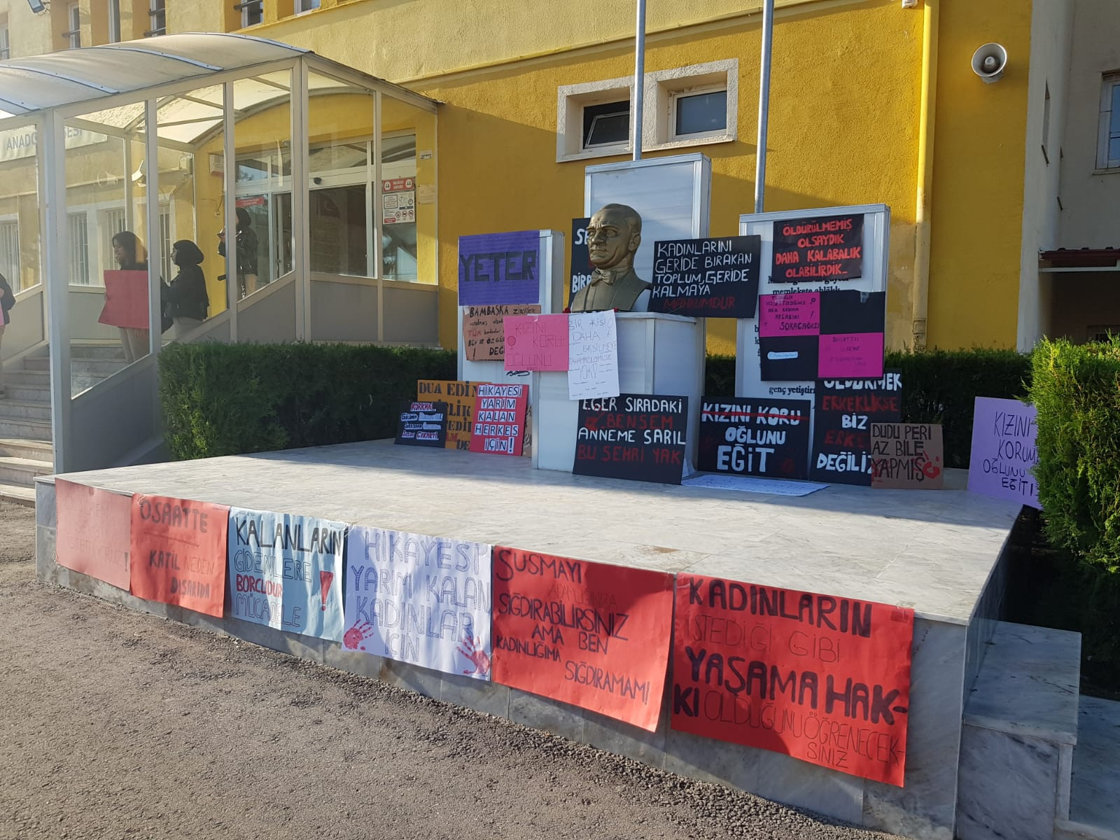 Beyşehir Ali Akkanat Anadolu Lisesi önünde düzenlenen etkinlikte öğrenciler, kadın cinayetleri ve kadına şiddete yönelik tepki ve toplumsal mesajlar içeren içeriklerin yer aldığı dövizleri Atatürk büstü önünde sergiledi.Bazı öğrenciler de ellerinde dövizleri taşıdı.