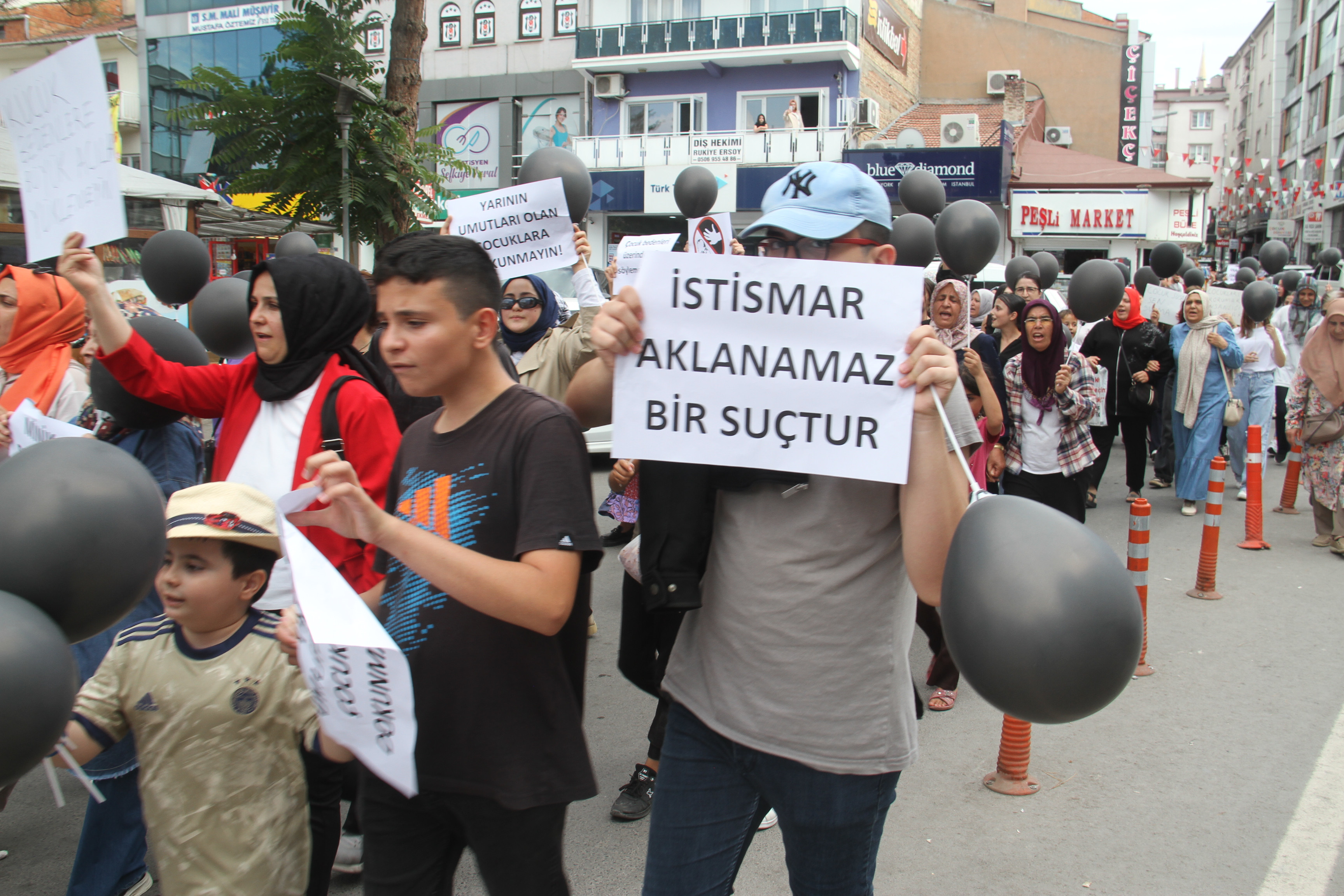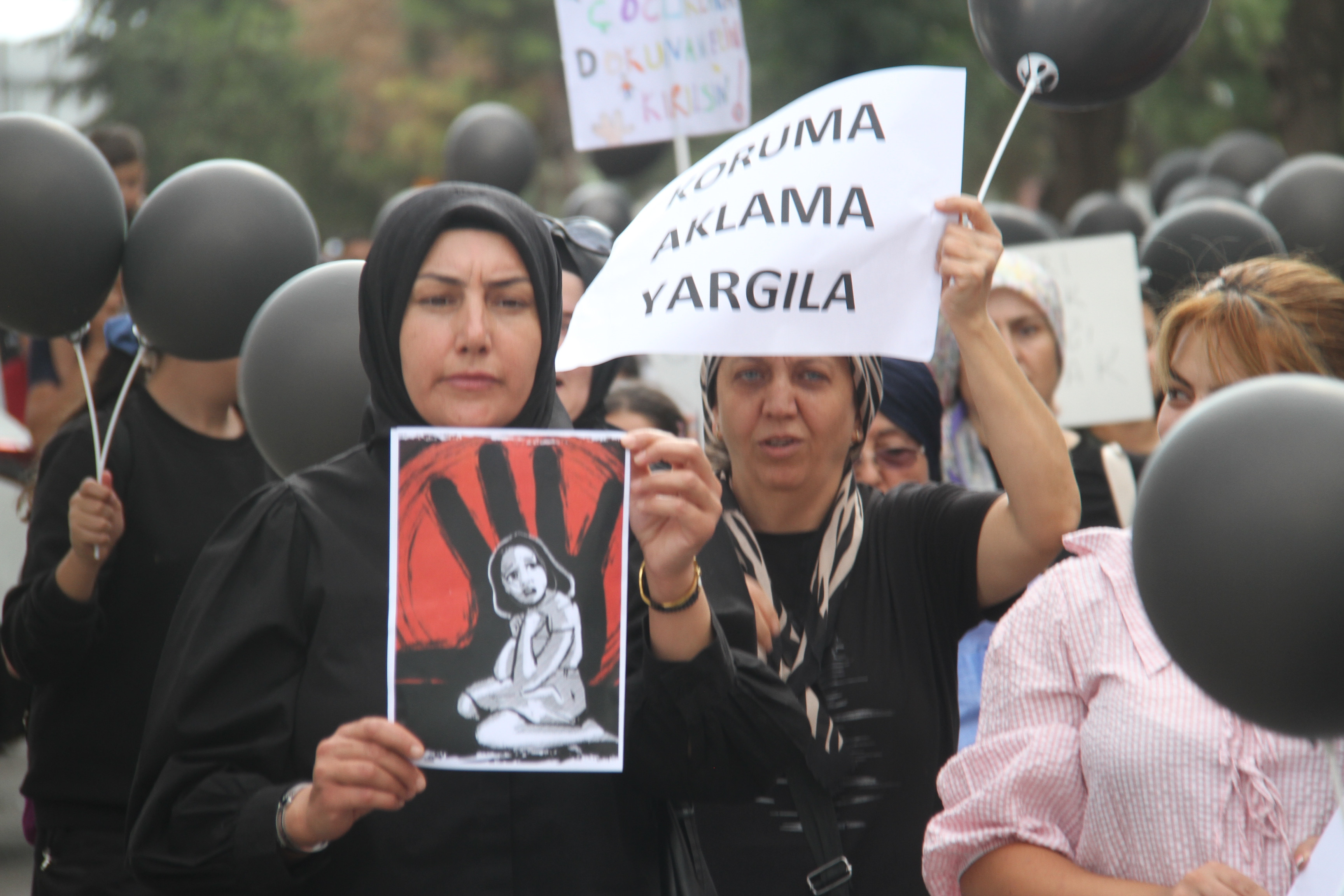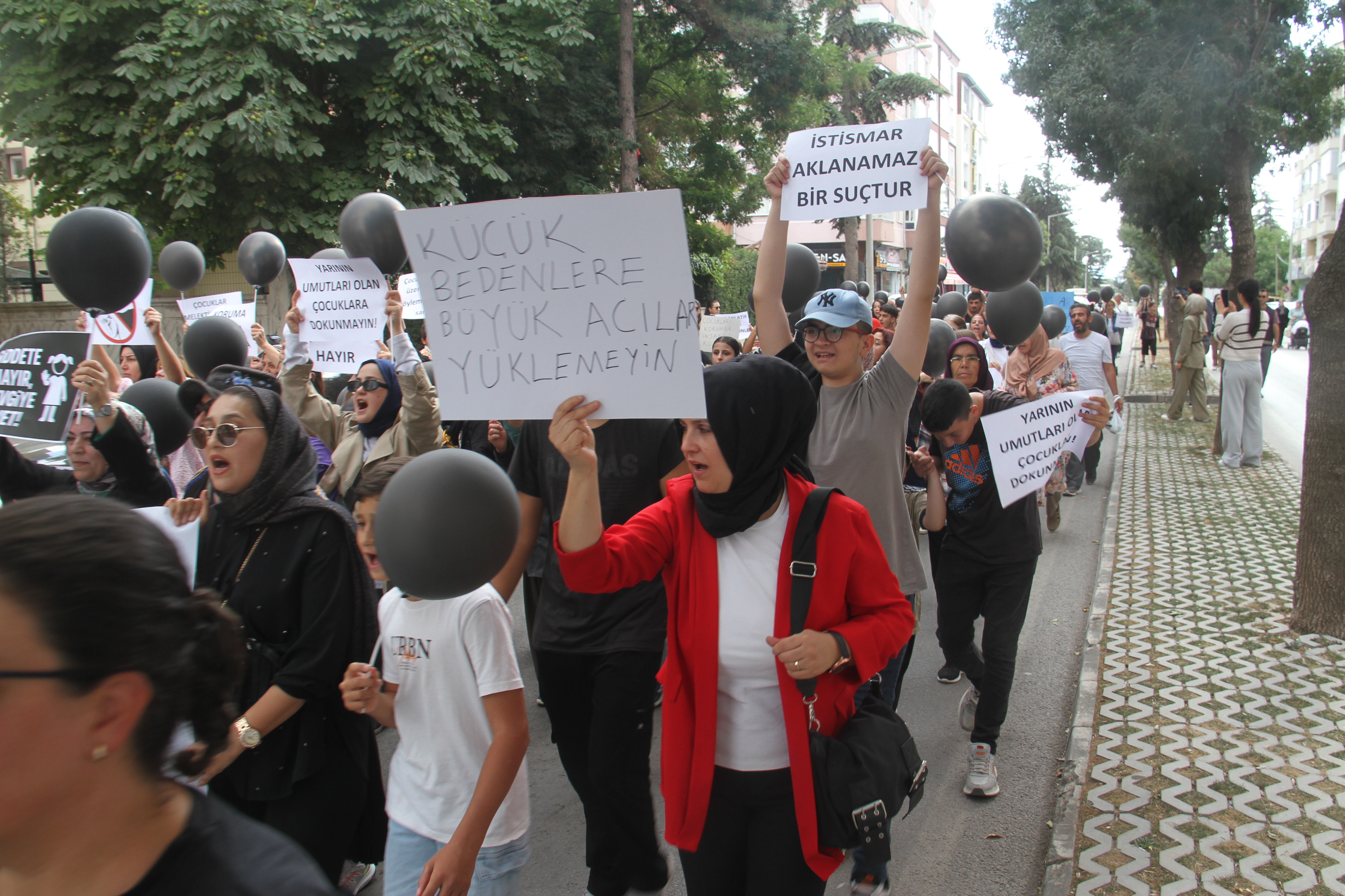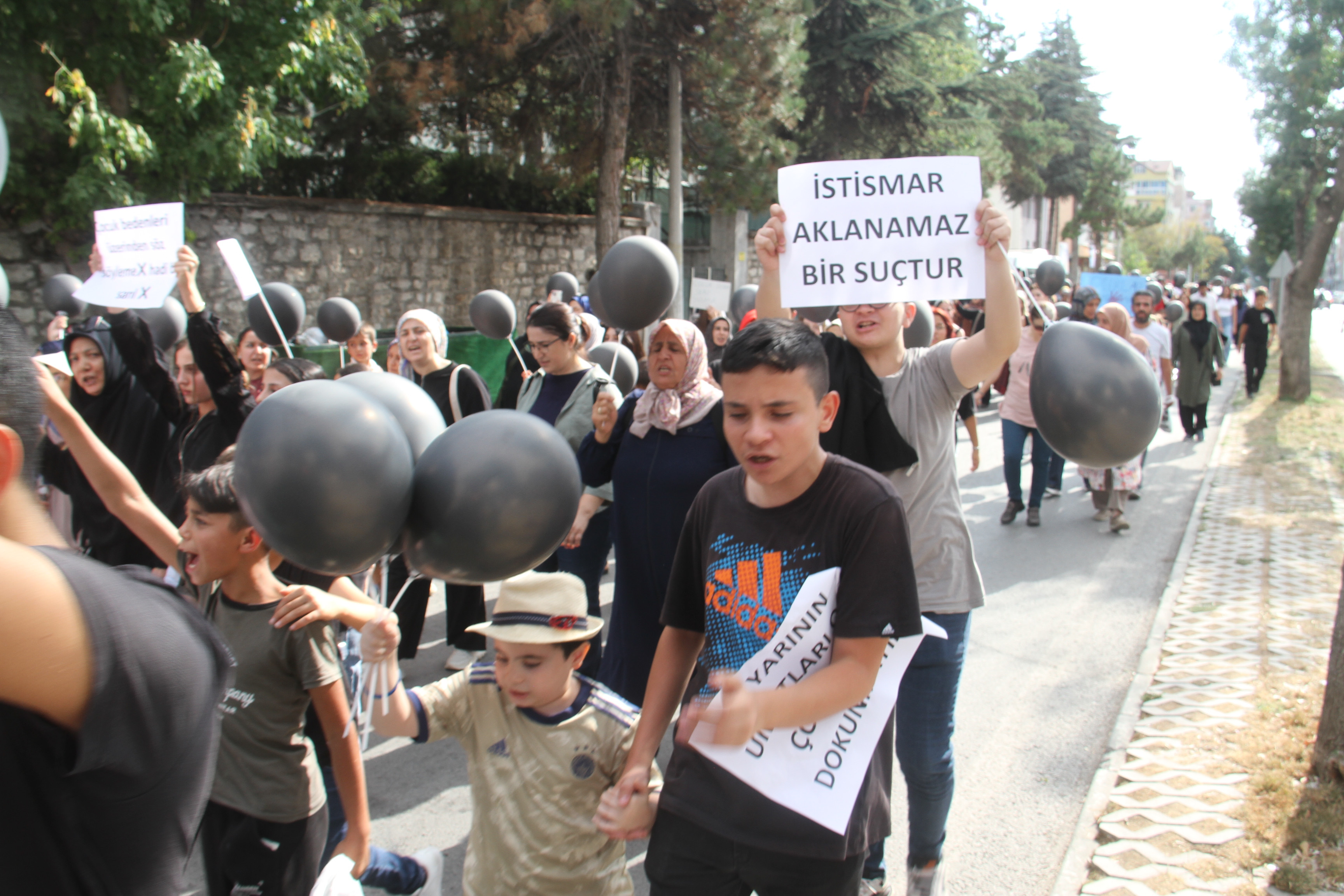 Kalabalık ellerinde, “yarının umutları olan çocuklara dokunmayın”, “istismar aklanamaz bir suçtur”, “koruma, aklama, yargıla”, “çocuklar melektir, bir cinsel obje değil”, “çocuk bedenleri üzerinden söz söyleme”, “çocuklara dokunan eller kırılsın”, “çocukları korumak, insanlığı korumaktır”, “çocuklar susar ama sen susma”, “küçük bedenlere büyük acılar yüklemeyin,şiddete hayır, sevgiye evet” içerikli döviz ve pankartlar taşıyarak yürüyüşü gerçekleştirdi.