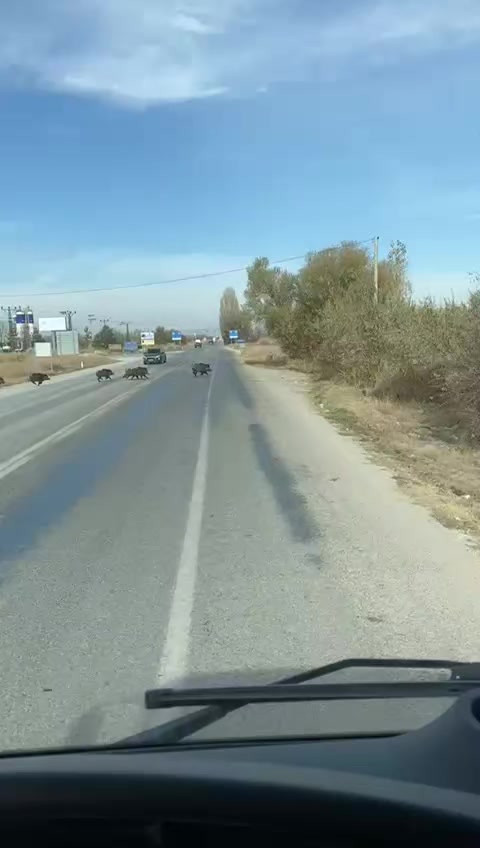 Beyşehir Isparta kara yolunda seyir halinde olan bir aracın sürücüsü, yola aniden çıkan yaban domuzu sürüsünü görünce hızını düşürdü.