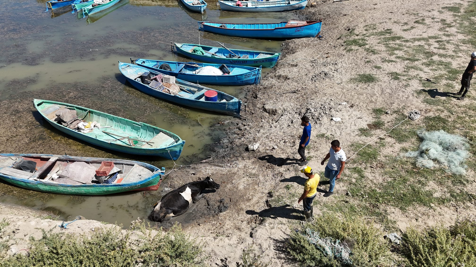 Bu arada, balıkçı limanına gölden su içmek için gelen bir inek de kıyıda oluşan balçığa saplandı.