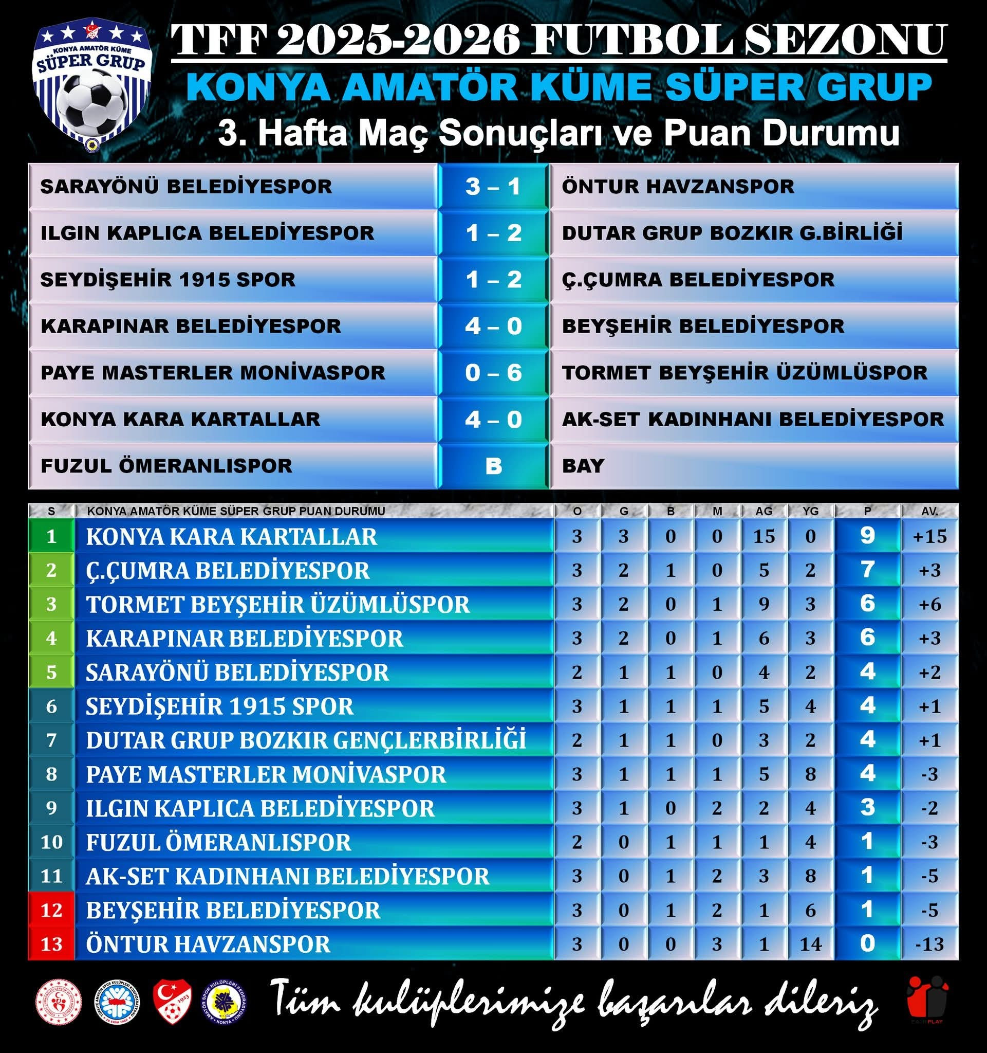 Sarayönü Belediyespor 3-Havzanspor 1, Ilgın Kaplıca Belediyespor 1-Bozkır G.Birliği 2, Seydişehir 1915 1-Ç.Çumra Belediyespor 2, Monivaspor 0-Tormet Üzümlüspor 6, Konya Kara Kartallar 4-Kadınhanı Belediyespor 0.