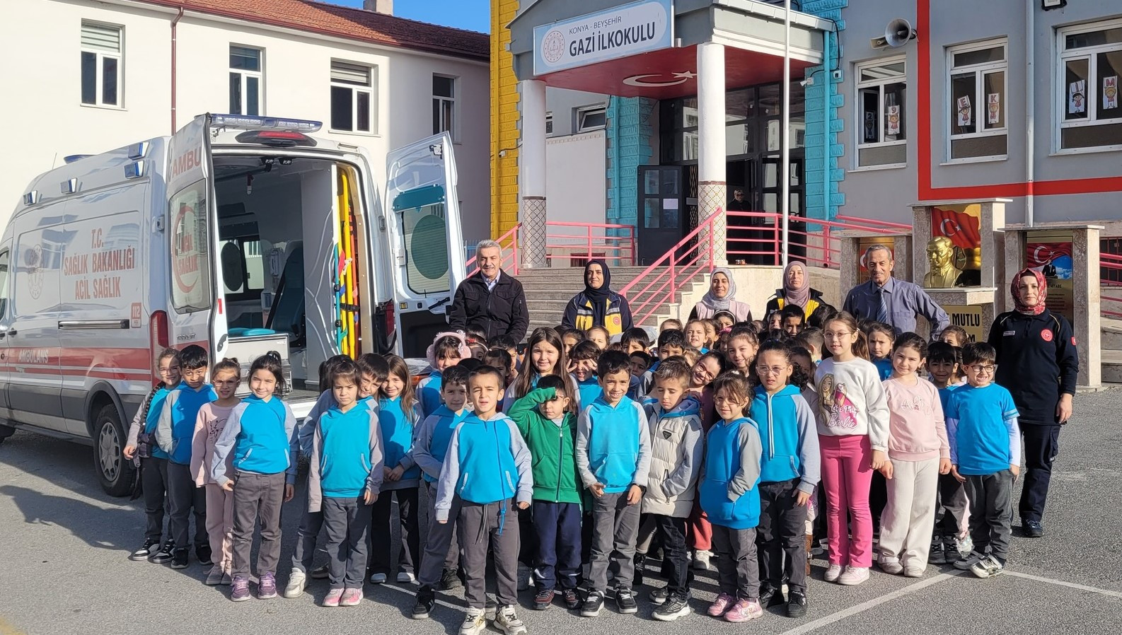 Beyşehir Gazi İlkokulu 1. sınıf öğrencileri, 112 Acil Yardım ve Çağrı Merkezi’nin çalışma sistemi hakkında bilgilendirildi.