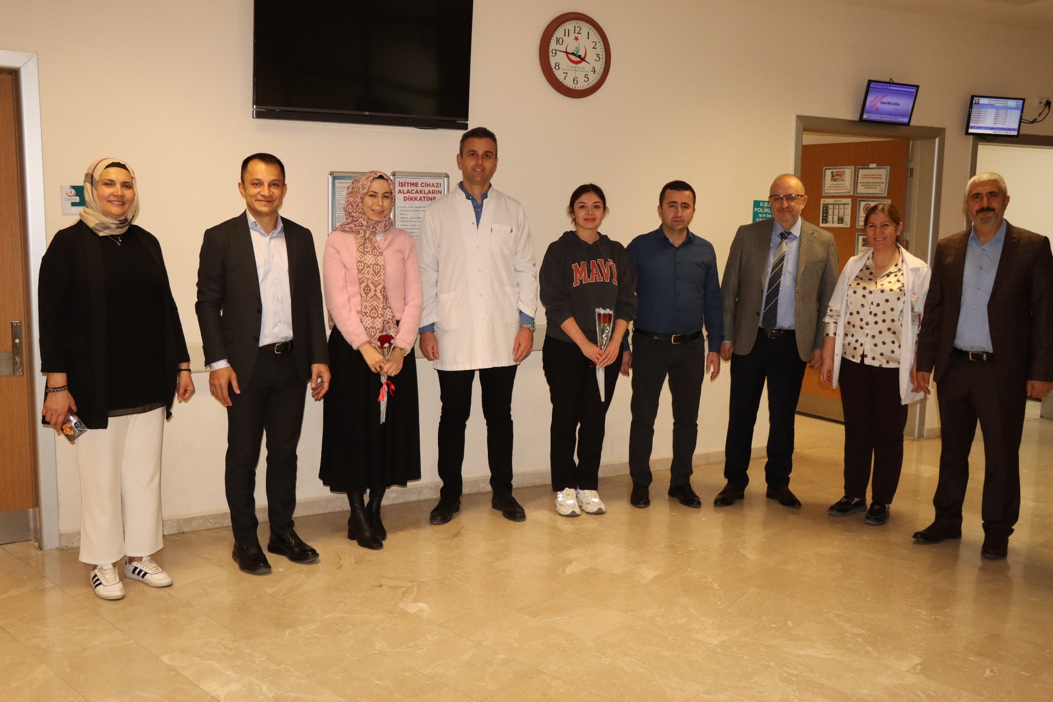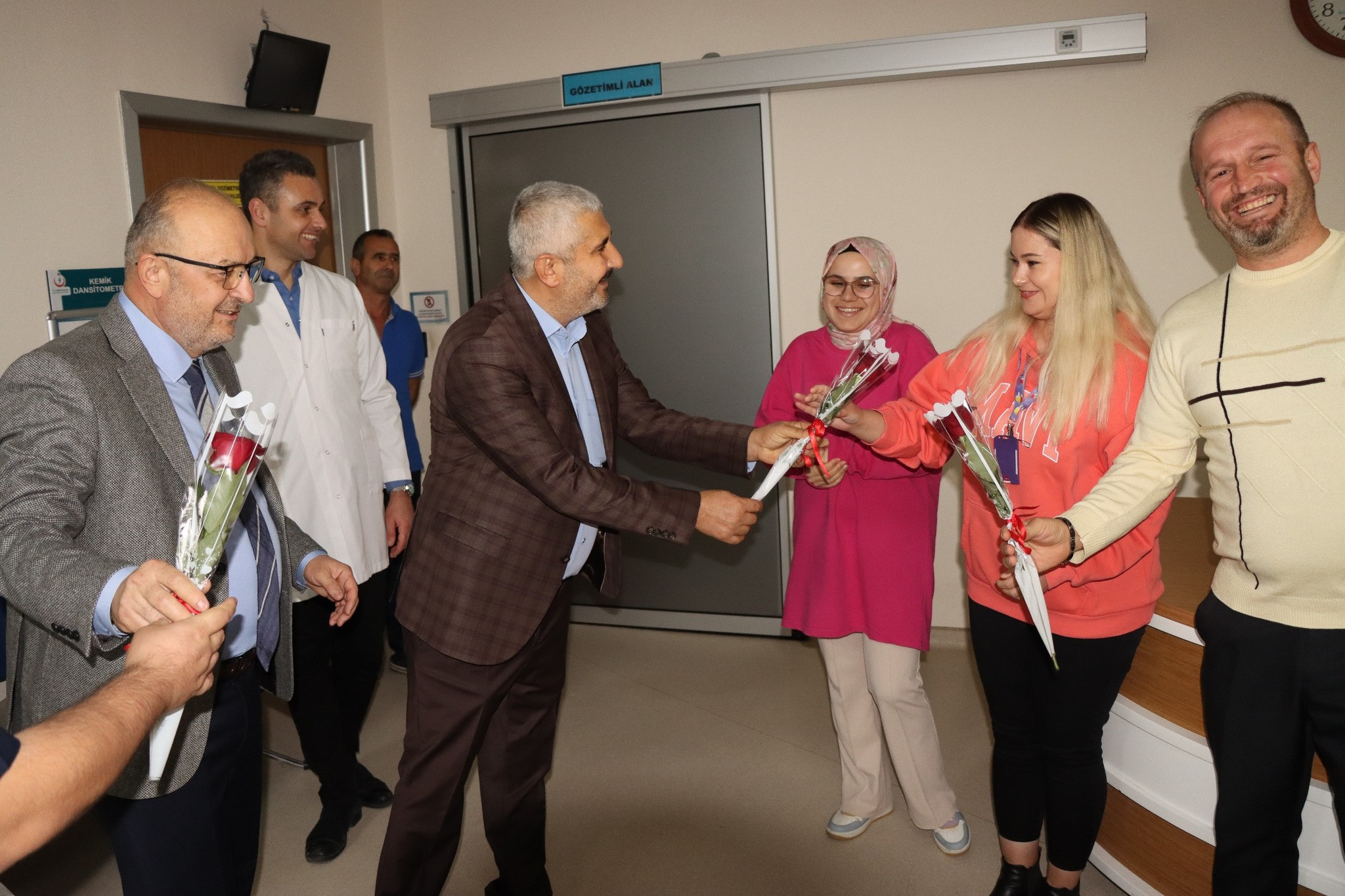 Başhekim Uzm. Dr. Sıtkı Küçükbuzcu, Başhekim Yardımcısı Dr. Kutay Güven, İdari ve Mali Hizmetler Müdürü Mesut Sodan, Sağlık Bakım Hizmetleri Müdürü Gülşen Parlakkaya, İdari ve Mali Hizmetler Müdür Yardımcısı Mustafa Akın ve Sağlık Bakım Hizmetleri Müdür Yardımcısı İlknur Gülol, hastanede görev yapan tıbbi sekreterleri tek tek ziyaret ederek çiçek takdim etti.