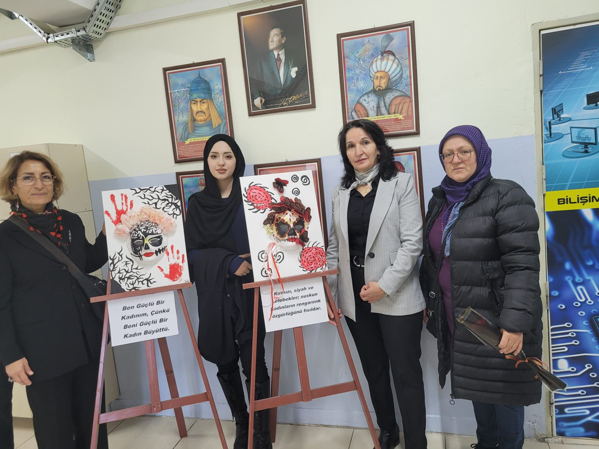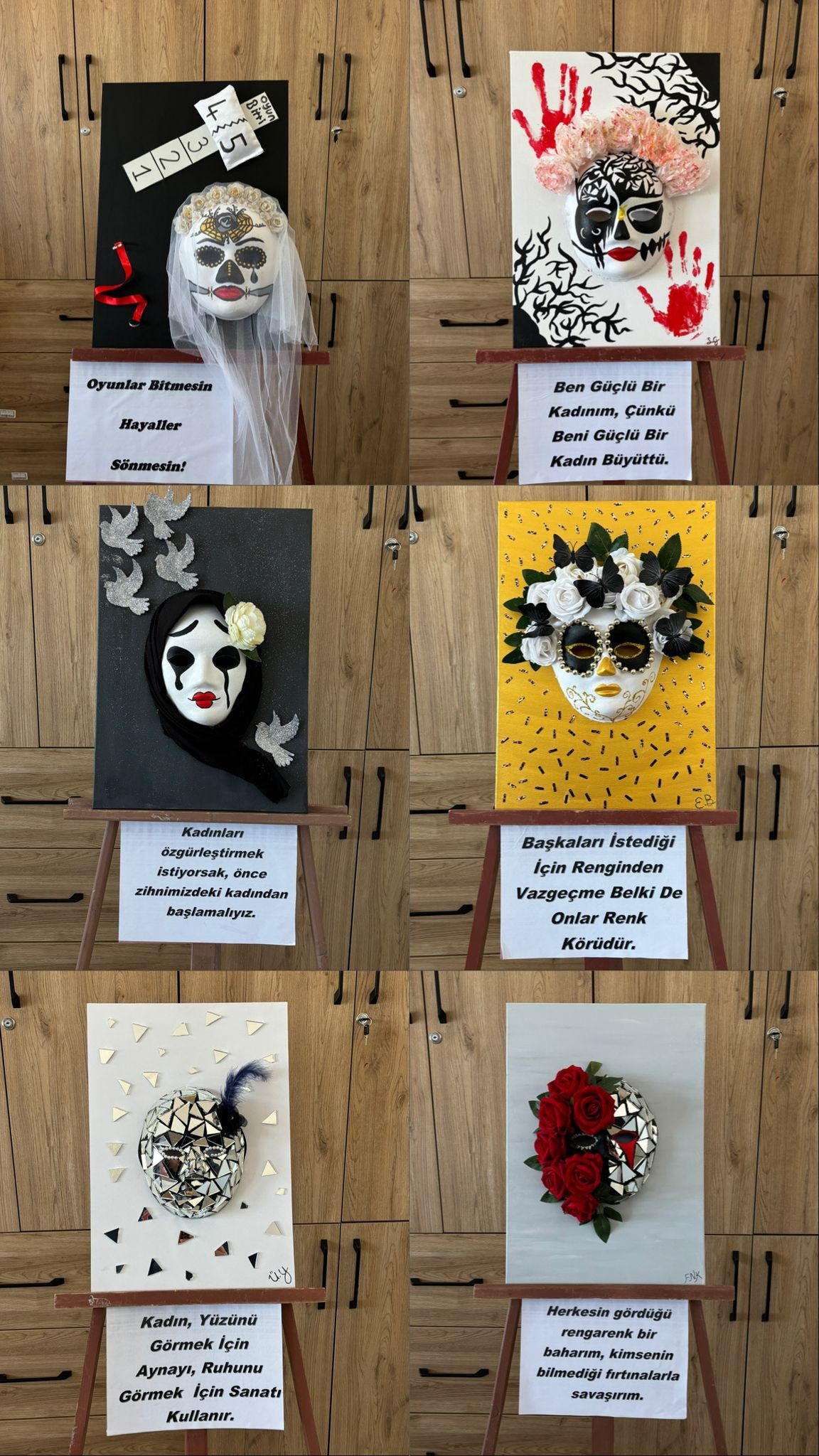 Dünya Kadınlar Gününde farkındalık oluşturmak için kadınlara ait çeşitli mesajlar içeren kadın maskeleri hazırlayan öğrenciler, bu maskeleri öğrenim gördükleri okulda ziyarete açtıkları sergi ile gözler önüne serdi.