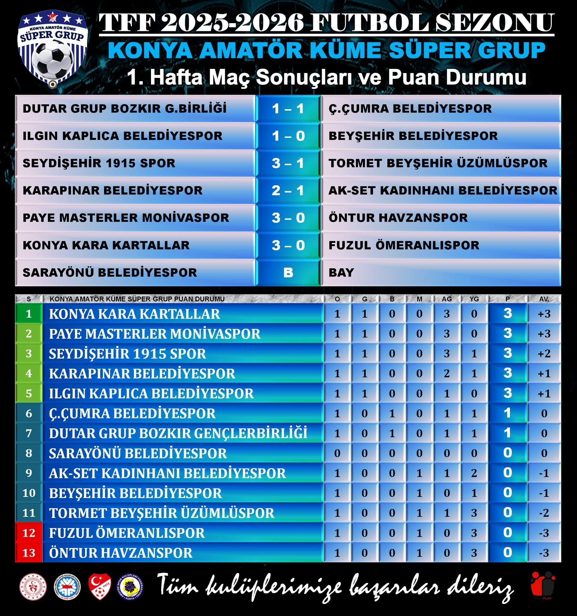 Dutar Bozkır Gençlerbirliği 1-Ç.Çumra Belediyespor 1, Karapınar Belediyesi 2-AK-SET Kadınhanı Belediyesi 1, Monivaspor 3-Öntur Havzanspor 0, Kara Kartallar 3-Fuzul Ömeranlıspor 0.