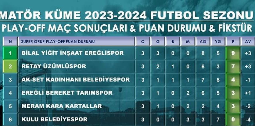 Retay Üzümlüspor, play off grubunda elde ettiği 3 puanla puanını 7’ye yükseltti ve 9 puanlı lider Bilal Yiğit İnşaat Ereğlispor’un gerisinde ikinci sıraya yerleşti.