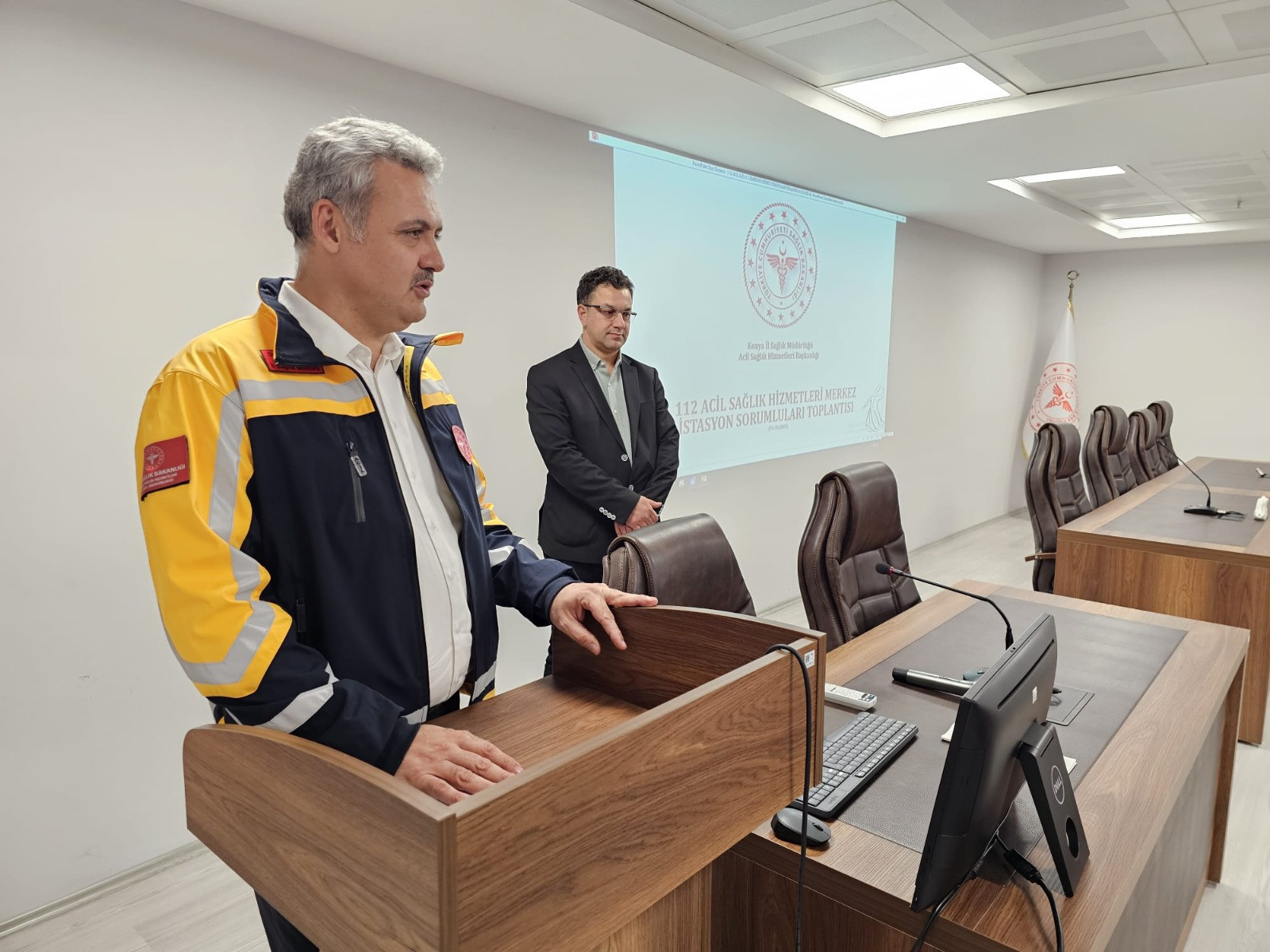 112 Acil Sağlık Hizmetleri İstasyon sorumluları ile gerçekleştirilen değerlendirme toplantısına, Acil Sağlık Hizmetleri Başkanı Dr. Ahmet Ergin, Başkan Yardımcısı Dr. Alper Çelikdelen, 112 Komuta Kontrol Merkezi Başhekimi Uzm. Dr. Burak Polat ve Başhekim Yardımcısı Dr. Nuri Güngör de katıldı.